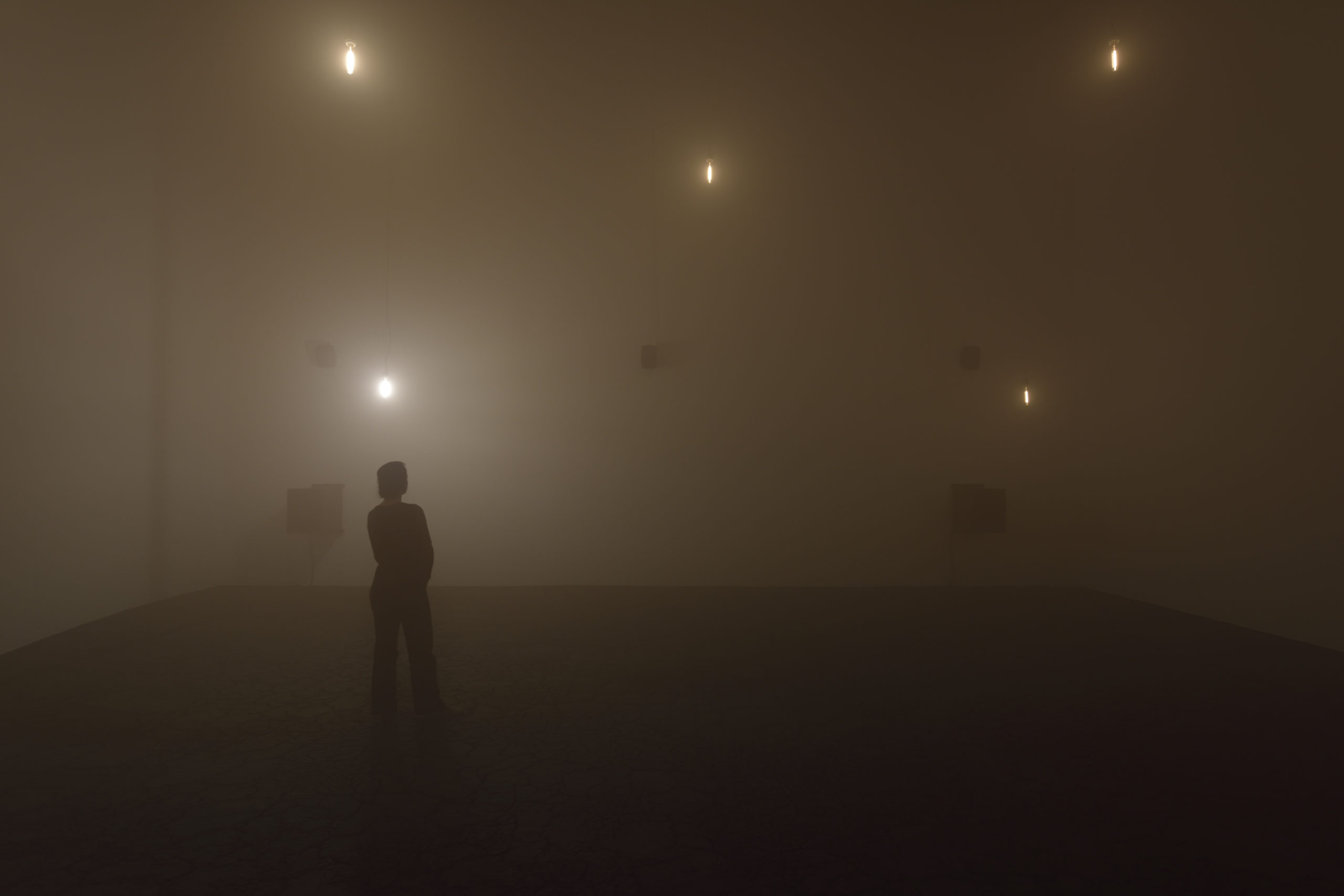 The dark, cracked surface, marked with words that verge on the incantatory, breaks away from the neutrality of the white cube. A multilayered soundscape, ranging from deep, earthy bass tones to more ethereal voices, envelops the space, giving the installation the gravity of a suspended ritual. A troubled, haunted atmosphere seems to linger in the room, as if the memory of the site were still inscribed in the material itself.