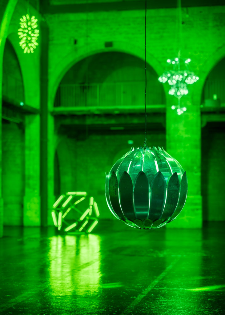 For his first museum exhibition in Europe, Trevor Yeung (1988, Hong Kong) has transformed the main hall of a former colonial goods warehouse in Bordeaux. He invites visitors to rediscover the space with fresh eyes and participate in the creative process by tying coloured ribbons to a scaffolding bridge. Known for his work exploring light and ecological issues, Trevor Yeung gives form here to natural phenomena and human desires through an immersive, participatory installation. Using photography, as well as spheres and sculptures of luminous mushrooms, he creates a poetic environment where physical matter and life intersect.